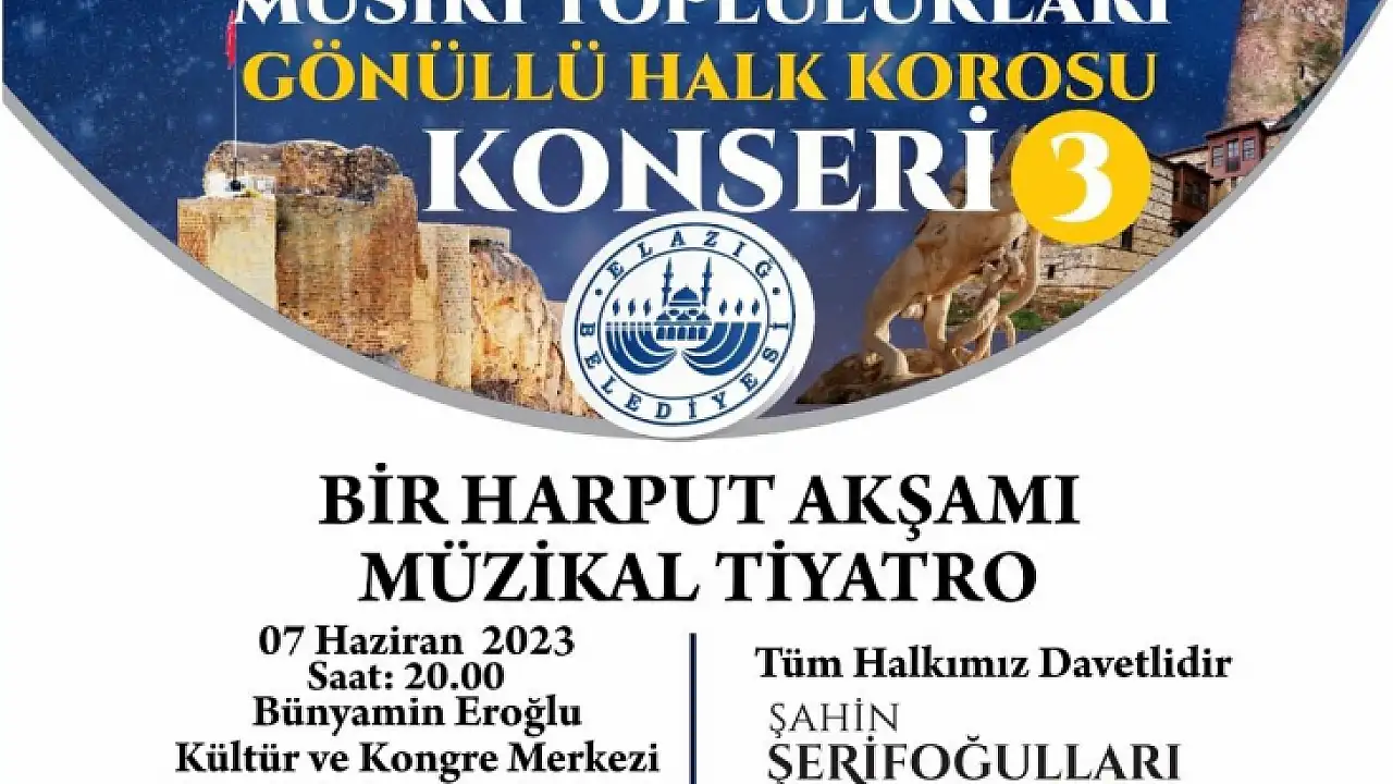 Elazığ Belediyesi Basın-Yayın ve Halkla İlişkiler Müdürlüğü’nden yapılan açıklamada, “Elazığ Belediyesi Kültür ve Sosyal İşler Müdürlüğü’ne bağlı musiki toplulukları tarafından oluşturulan Gönüllü Halk Korosu’nun üçüncüsünü gerçekleştireceği konserde gönüllü halkımız Harput eserlerini seslendirecek ve Harput hikayelerini canlandıracak. ’Bir Harput Akşamı’ adlı müzikal tiyatro konserimiz ise halkımızla buluşacak. 7 Haziran Çarşamba günü Bünyamin Eroğlu Kültür ve Kongre Merkezi’nde saat 20.00’de gerçekleştireceğimiz konserimize tüm halkımız davetlidir” denildi.