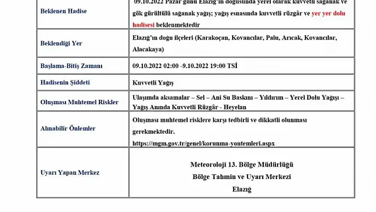 Meteoroloji 13. Bölge Müdürlüğü Bölge Tahmin ve Uyarı Merkezinden yapılan açıklamada, Elazığ’ın doğu ilçelerinde kuvvetli sağanak yağış, yağış esnasında kuvvetli rüzgar ve yer yer dolu yağışının beklendiği belirtildi. Yaşanabilecek olumsuzluklara karşı vatandaşların duyarlı olması istendi.
