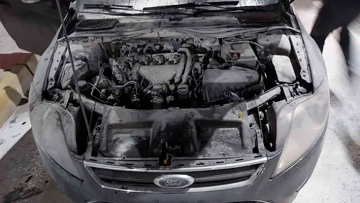 Motor kısmından yanan araçta maddi hasar meydana gelirken, olayla ilgili inceleme başlatıldı.