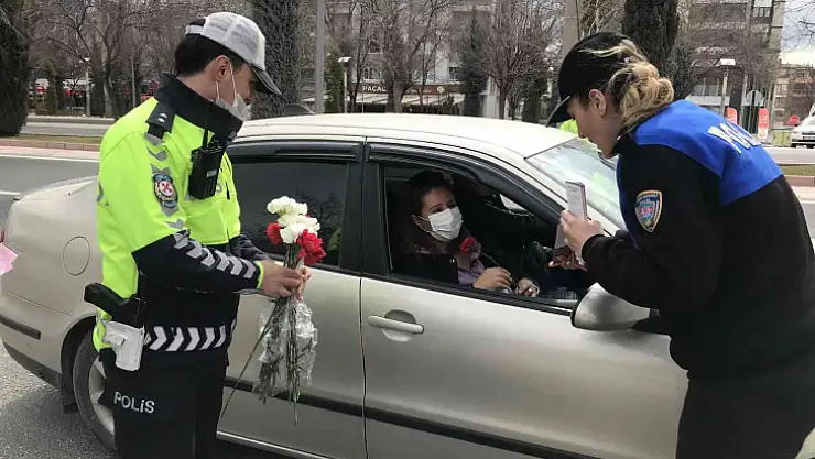Elazığ İl Emniyet Müdürlüğü ekipleri, 8 Mart Dünya Kadınlar Günü dolayısıyla trafikte yaptıkları uygulamada, kadınları karanfillerle karşıladı.